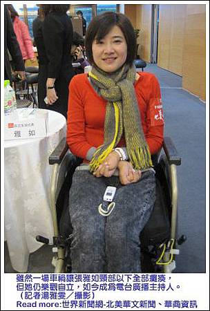 「雖然我雙手雙腿不能動,但我還有嘴巴,可以唱歌講話」,長相甜美的張雅如,坐在輪椅上滔滔不絕說著自己的夢想,很難想像她17歲時,因為騎腳踏車去工廠找母親,回程不幸被轎車撞成癱瘓。